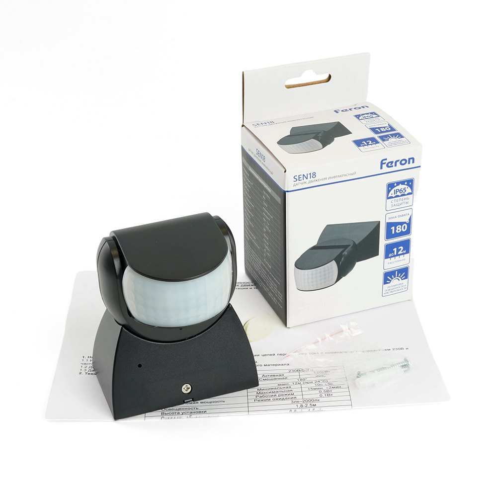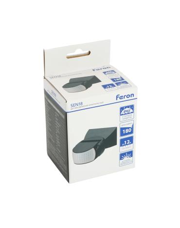 Датчик движения и освещенности FERON SEN18 инфракрасный, накладной, IP65, 230V, 1200W, расстояние обнаружения 12м, угол обнаружения 180°, с регулировкой освещенности и времени задержки и расстояния обнаружения, цвет чёрный, 119*80*51мм