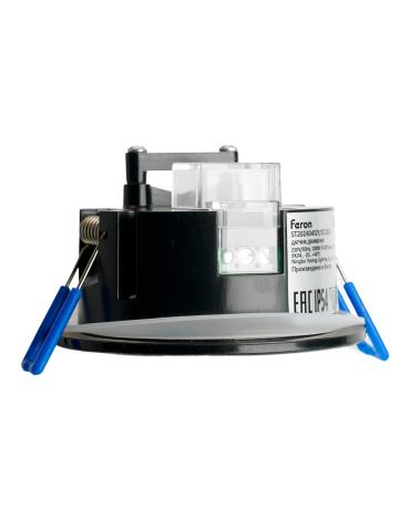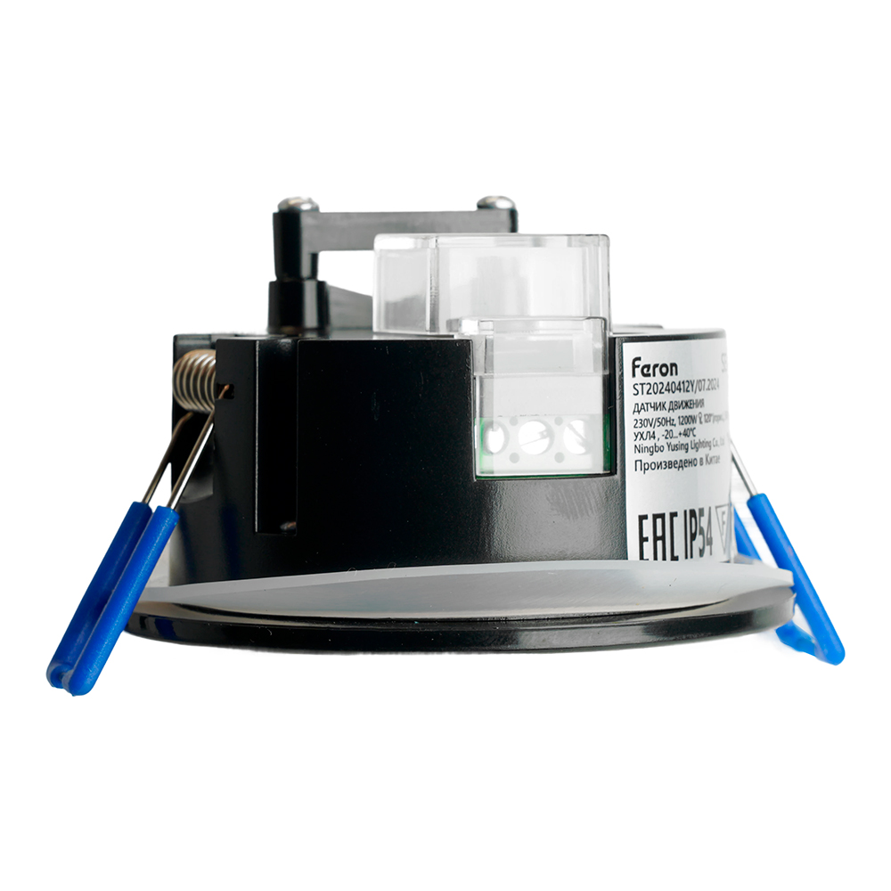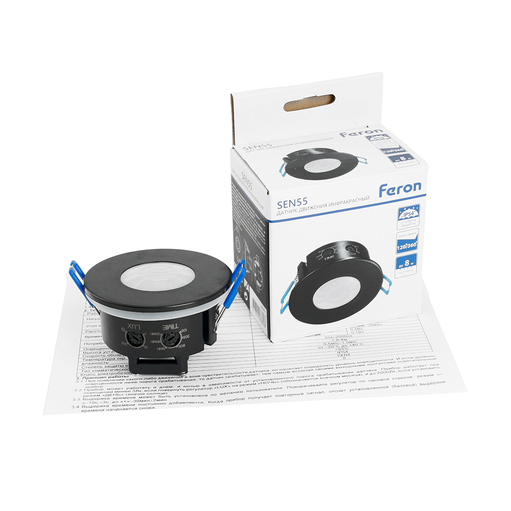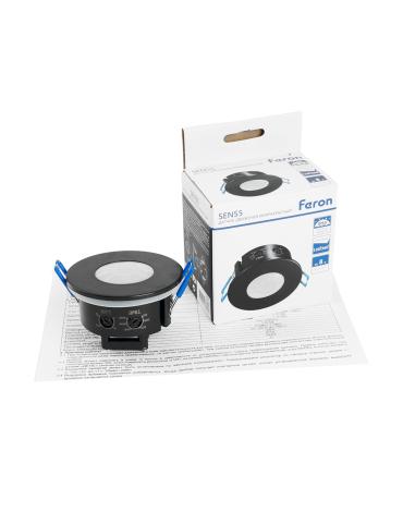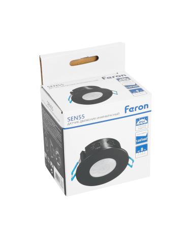 Датчик движения и освещенности FERON SEN55 инфракрасный, встраиваемый, IP54, 230V, 1200W, расстояние обнаружения 8м, угол обнаружения 120°(гориз.), 360°(верт.), с регулировкой освещенности и времени задержки, цвет чёрный, 76*49мм