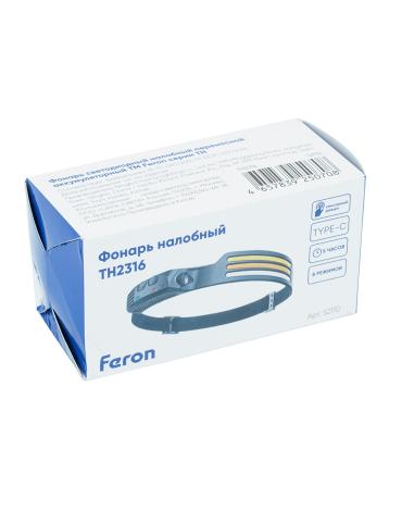 Фонарь налобный FERON TH2316 c аккумулятором 5W, 1200mAh IP44, USB type-C, ABS пластик, резина