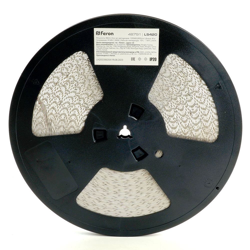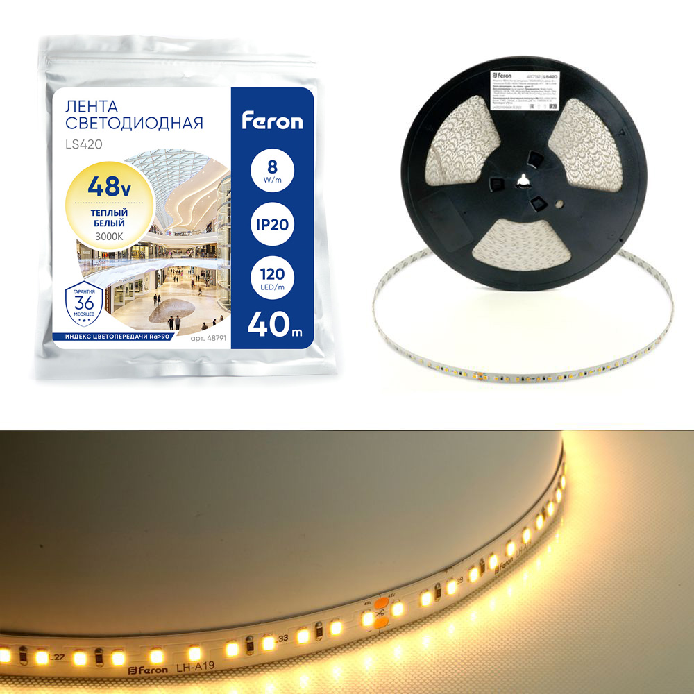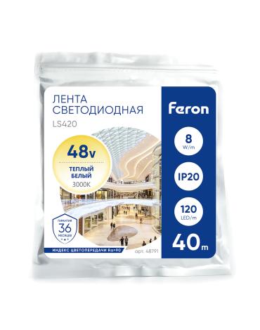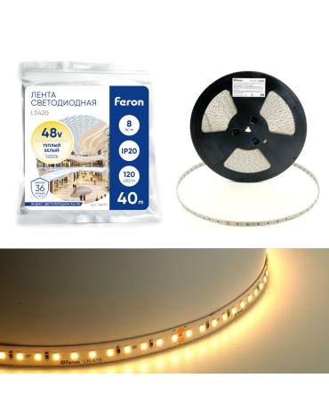 Лента светодиодная стабилизированная 120SMD(2835)/м 8Вт/м 48V 40000*10*1.22мм 3000К, IP20 LS420 FERON