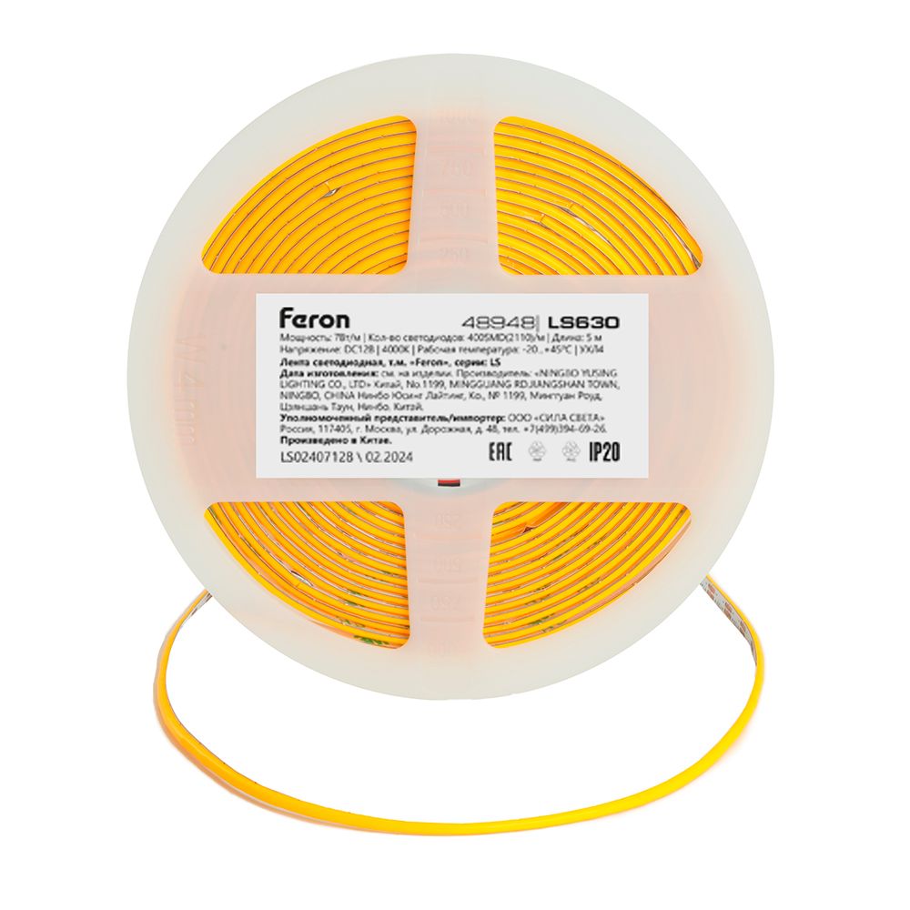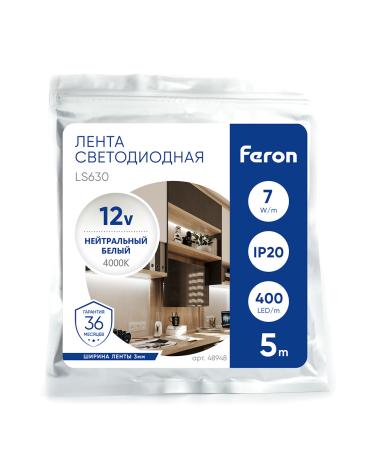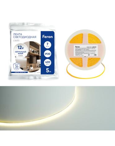 Лента светодиодная 12V FERON LS630, 400*COB, 7W/m, IP20, 4000К (нейтральный белый), Кратность резки мм 10мм, 5000*3*1,80мм