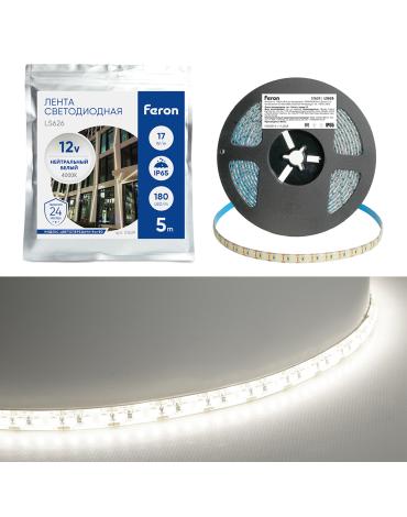 Лента светодиодная 12V FERON ls626, 180*SMD2835, 17W/m, IP65, 4000К (нейтральный белый), Кратность резки мм 16.5мм, 5000*10*1,22мм