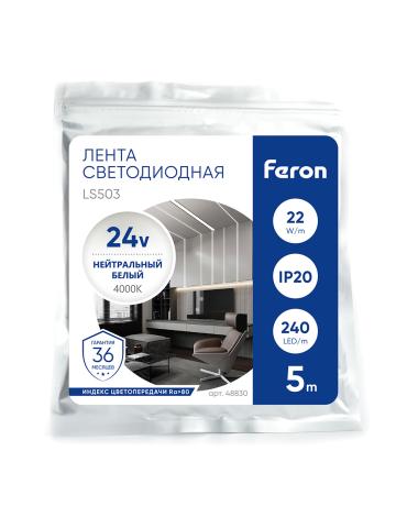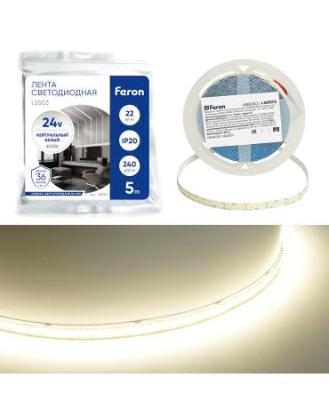 Лента светодиодная 24V FERON LS503, 240*SMD2835, 22W/m, IP20, 4000К (нейтральный белый), Кратность резки мм 25 мм, 5000*10*1.22мм