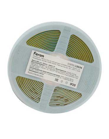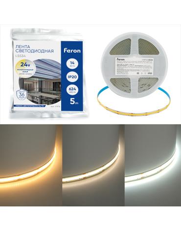 Лента светодиодная 24V FERON LS534, 624*COB, 14W/m, IP20, 2700K-6500K (теплый белый/нейтральный белый/холодный белый), Кратность резки мм 38.46мм, 5000*10*1,80мм