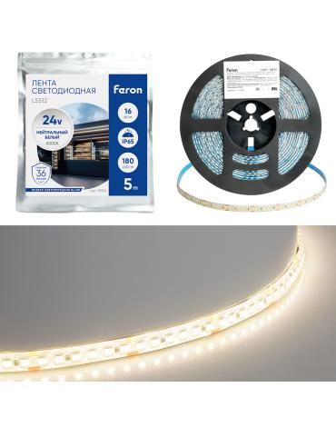 Лента светодиодная 24V FERON LS512, 180*SMD2835, 16W/m, IP65, 4000К (нейтральный белый), Кратность резки мм 33мм, 5000*10*2.3мм