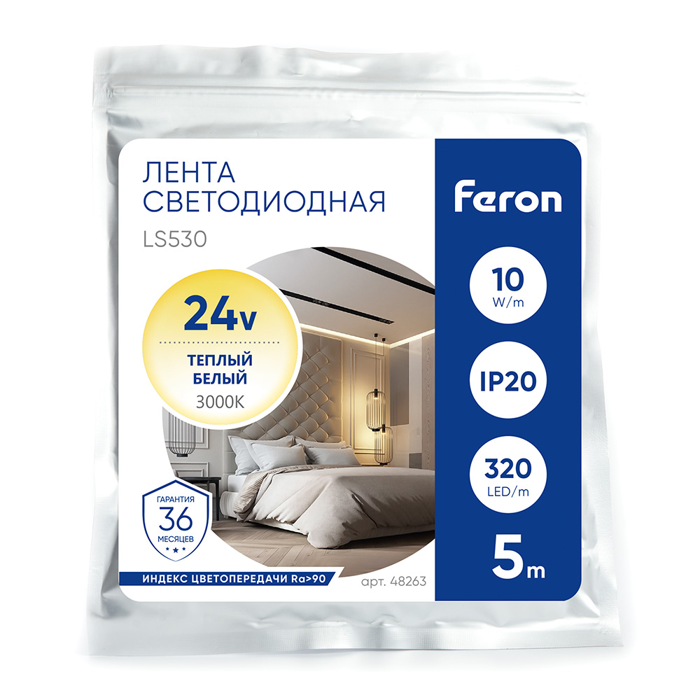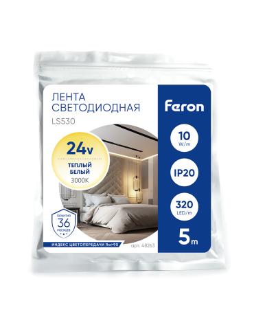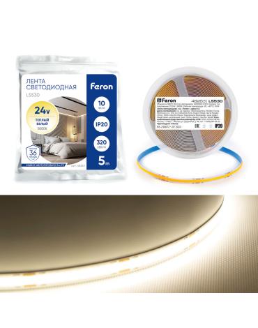 Лента светодиодная 24V FERON LS530, 320*COB, 10W/m, IP20, 3000К (теплый белый), Кратность резки мм 50мм, 5000*8*1,80мм