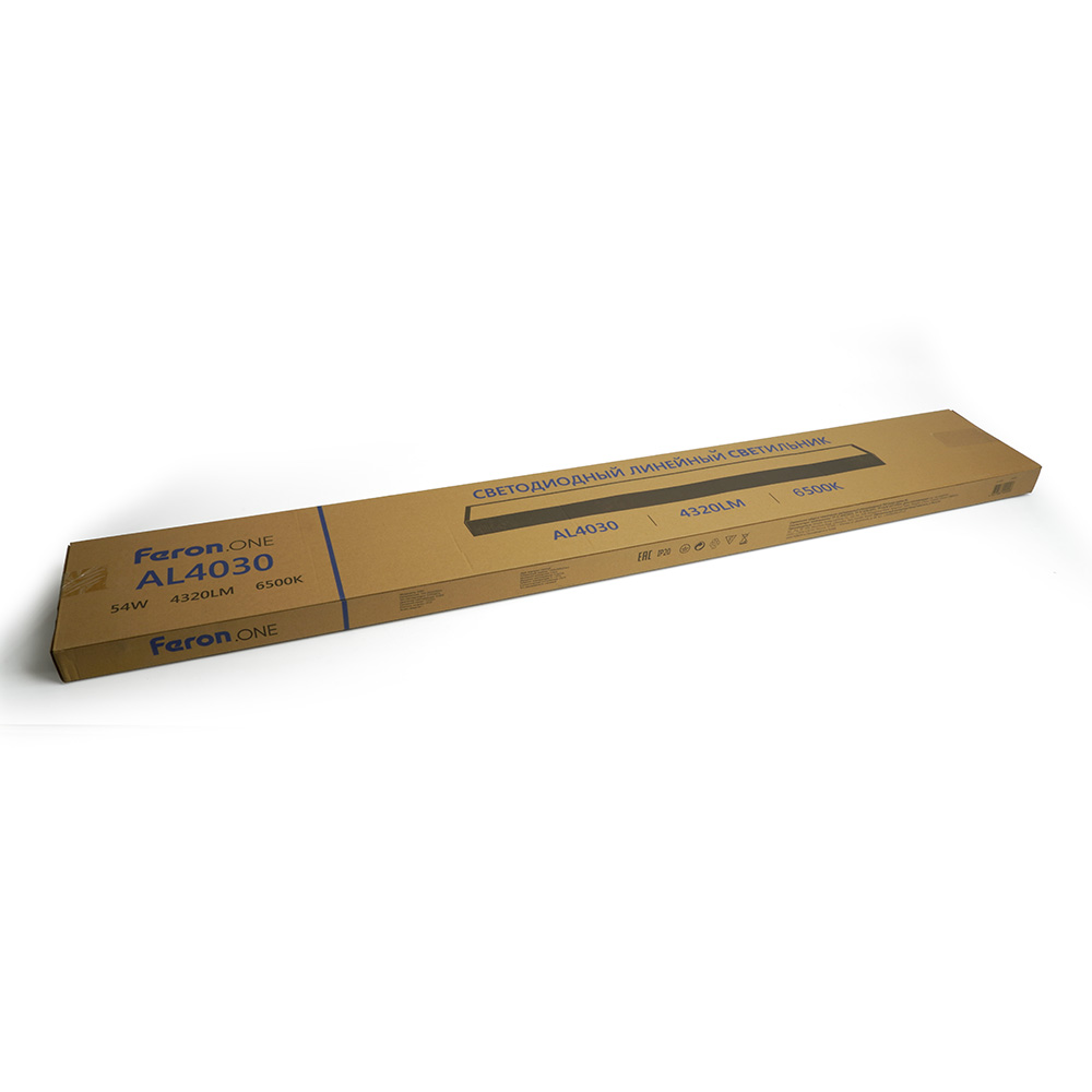 Светильник линейный светодиодный, (ДПО) FERON AL4030, 54W, 6500К (дневной), 165-265V, 4320Lm, IP20, цвет черный, корпус сталь, рассеиватель пластик, 1200*200*40 мм