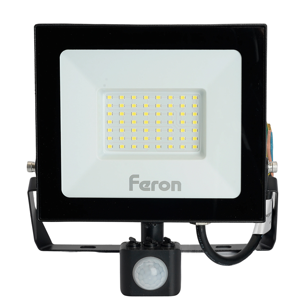 Прожектор светодиодный многоматричный с монтажным креплением на кронштейн, с инфракрасным датчиком движения (ДО) FERON LL-908, 50W, 6400К (холодный белый), 230V/50Гц, 5000Lm, IP65, угол рассеивания 120°, 48*SMD2835, раб.t -40°C - +40°C, цвет черный, корпус алюминий литой под давлением + стекло, 185*197*64 мм