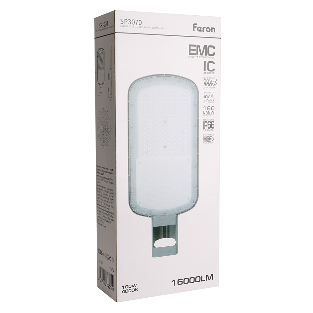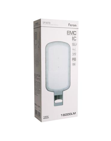 Уличный светильник консольный светодиодный, на столб (ДКУ) FERON SP3070 , 100W, 4000К (дневной), 90-300V/50Гц, 16000Lm, IP66, угол рассеивания 120°, 120LED*SMD3030, класс защиты 1, раб.t -55°..+50°С, цвет серый, корпус алюминий, 476*204*75мм,