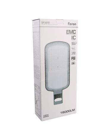 Уличный светильник консольный светодиодный, на столб (ДКУ) FERON SP3070, 100W, 5000К (дневной), 90-300V/50Гц, 16000Lm, IP66, угол рассеивания 120°, 120LED*SMD3030, класс защиты 1, раб.t -55°..+50°С, цвет серый, корпус алюминий, 476*204*75мм,