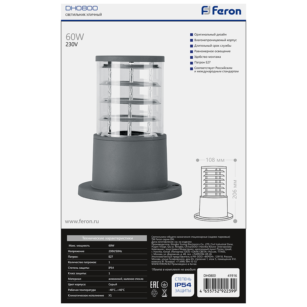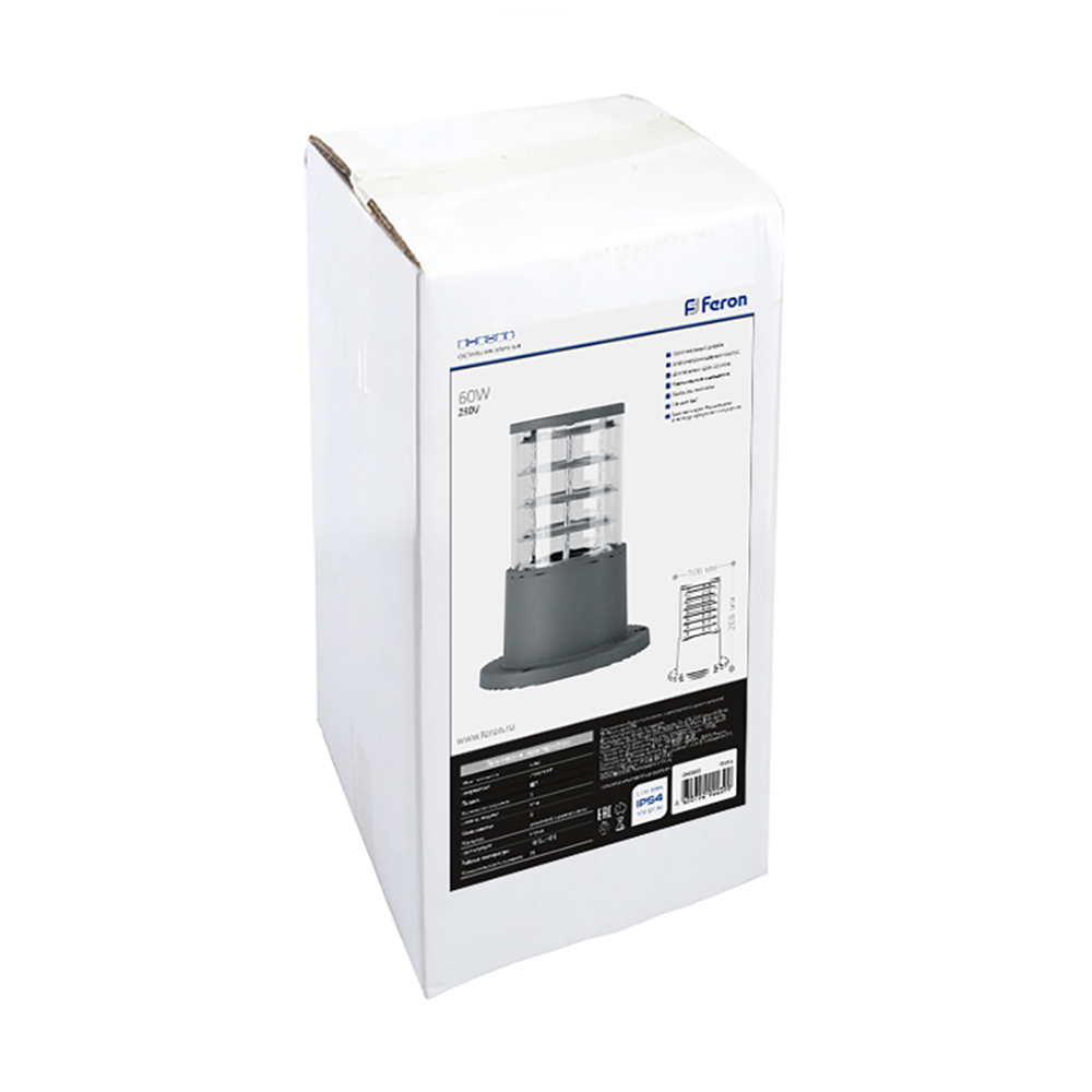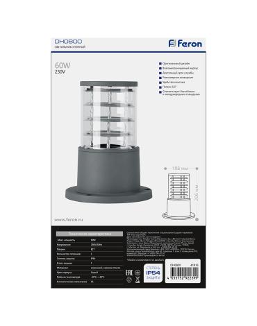 Светильник садово-парковый, серии «Сан-Франциско», (НТУ) FERON DH0800 60W, E27, 230V, IP54, цвет серый, цилиндр, столб, 108*108*206мм