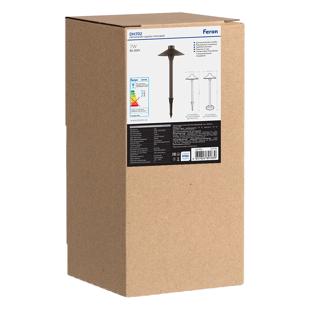 Светильник уличный светодиодный, На постамент/на колышке (ДТУ) FERON DH702, серия Берген, 7W, 2700К (теплый белый), AC85-265VV/50Гц, 120Lm, IP65, 1LED*COB, класс защиты 1, раб.t -40°C - +40°C, цвет коричневый, корпус алюминий, 200*200*510мм,