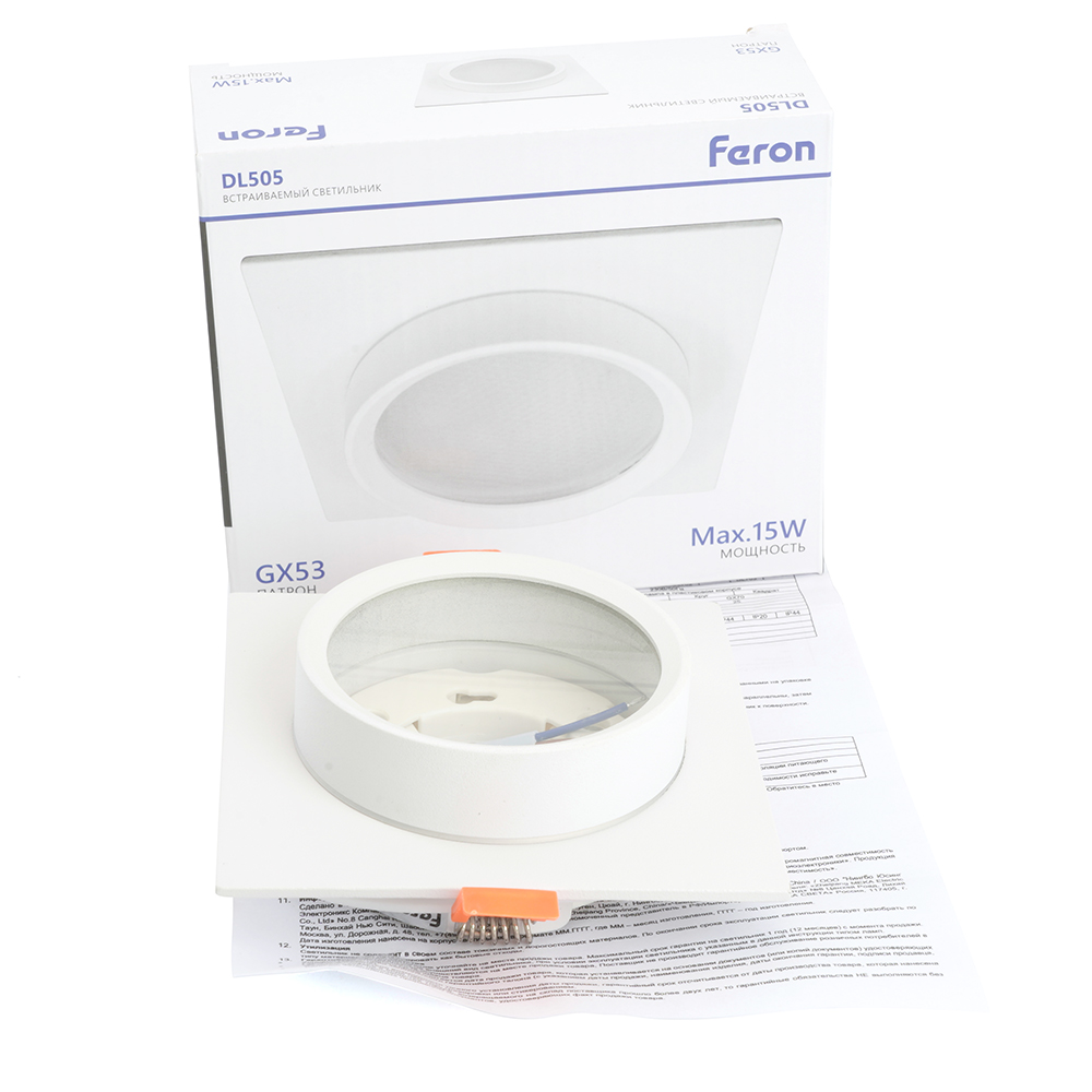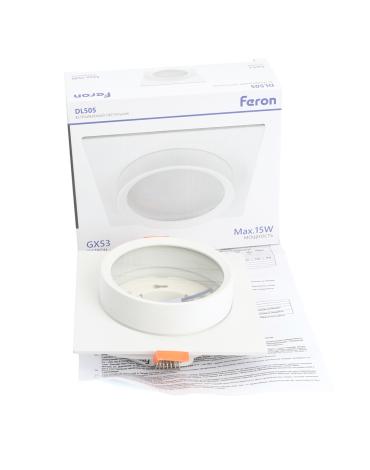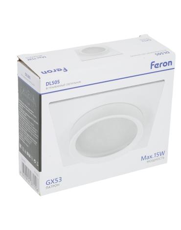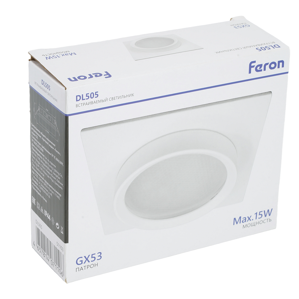 Светильник потолочный встраиваемый (ФВО) FERON DL505, под лампу GX53 GX53, белый, квадрат, 110*110*42 мм, монтажный диаметр 90мм, корпус металл+стекло, неповоротный