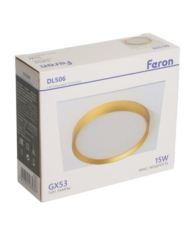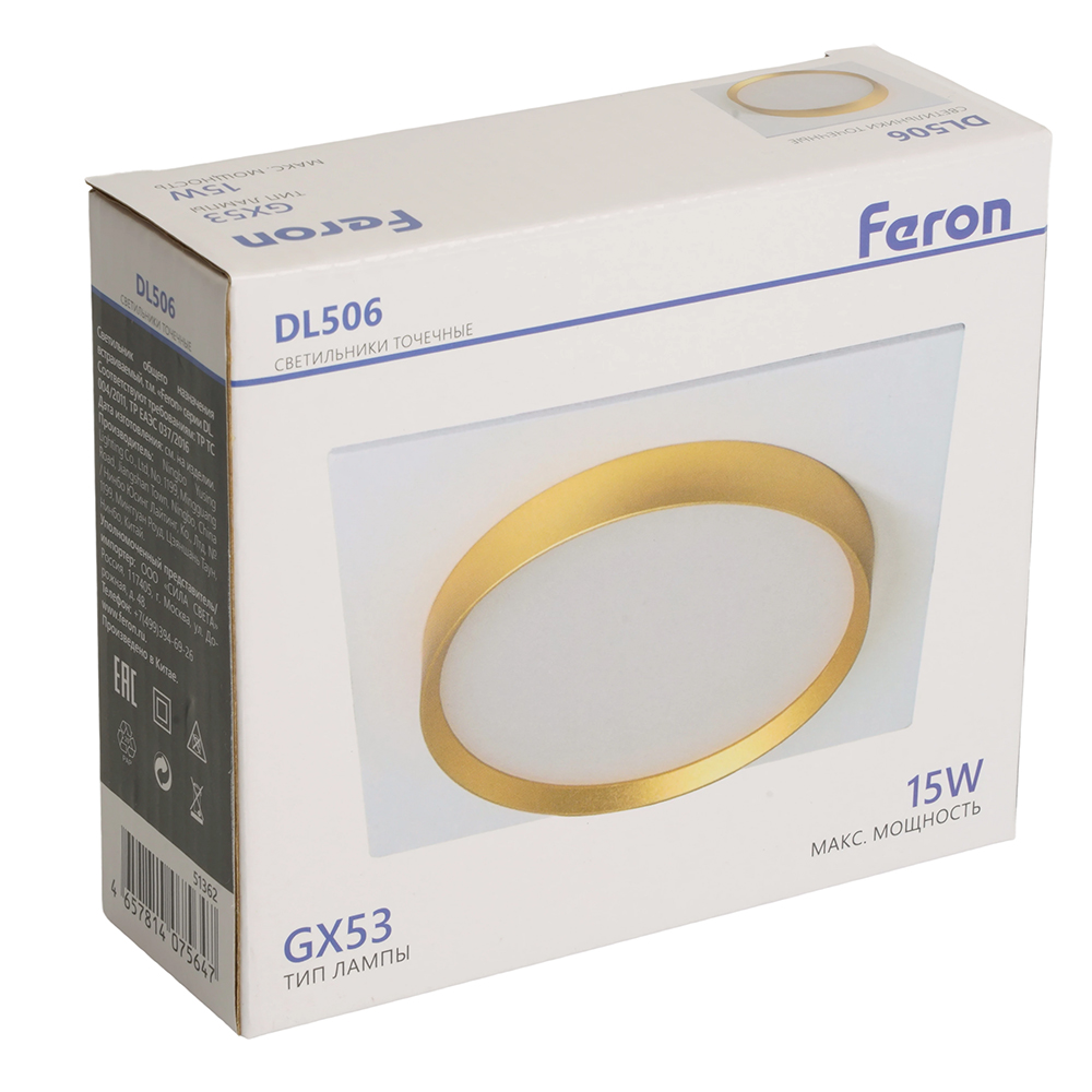 Светильник потолочный встраиваемый (ФВО) FERON DL506, под лампу GX53 GX53, белый+золото, квадрат, 110*110*40 мм, монтажный диаметр 90мм, корпус металл+акрил, неповоротный