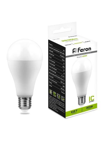 Лампа светодиодная FERON LB-130, A80 (шар), 30W 175-265V E27 4000К (белый), рассеиватель матовый белый, 2630Lm, угол рассеивания 220°, корпус пластик, 155*80мм