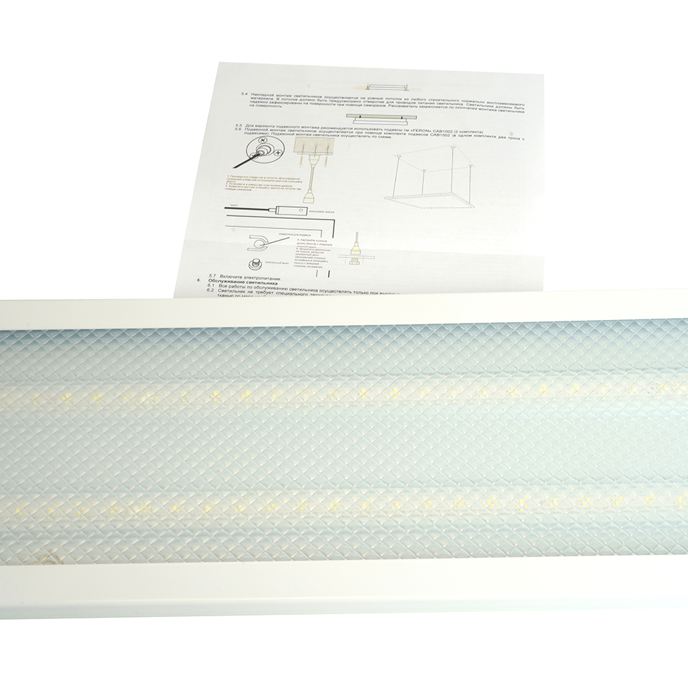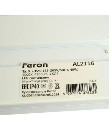 Светильник встраиваемый светодиодный, АРМСТРОНГ (ДВО) FERON AL2116, 48W 4000К (белый), 185-265V, 4500Lm, IP40, угол рассеивания 120°, цвет белый, корпус штампованная сталь, рассеиватель акриловый полимер с призматической структурой, 1200*180*17 мм, монтажн.отв. 1 200*180 мм.