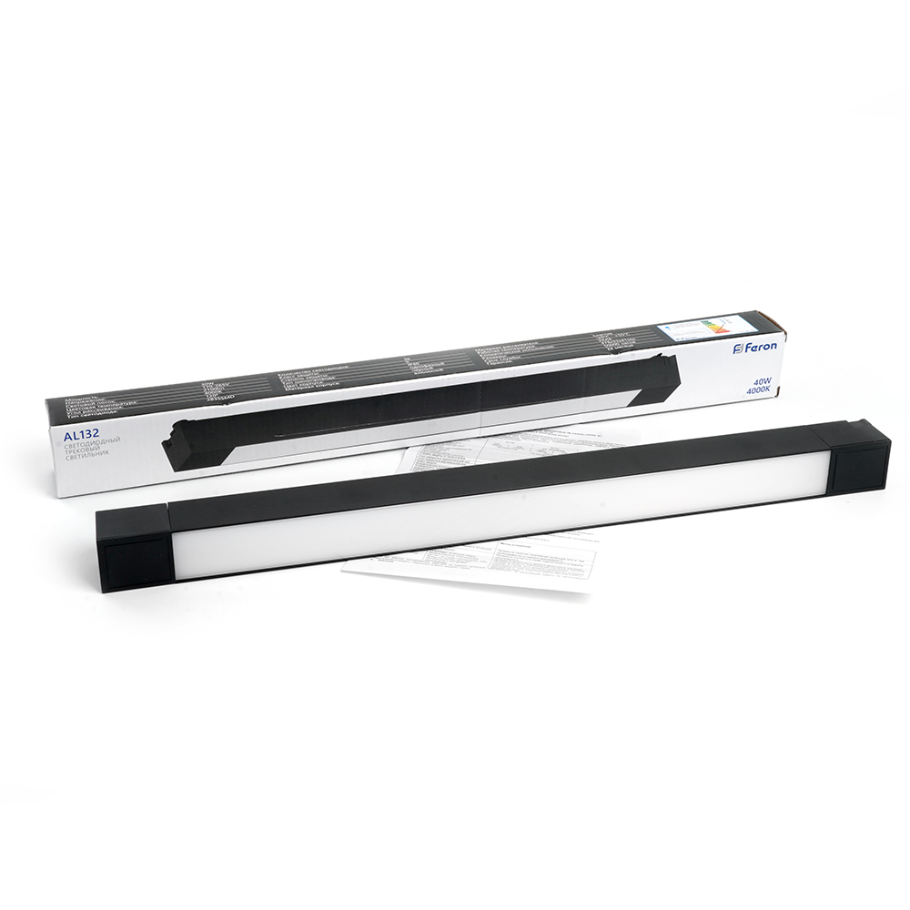 Светильник трековый на шинопровод, однофазный (ДПО) FERON AL132, 40W, 4000К (белый), 170-265V, 2800Lm, цвет черный, корпус алюминий, рассеиватель пластик, вращение →0°/↓0°, 607*33*41 мм
