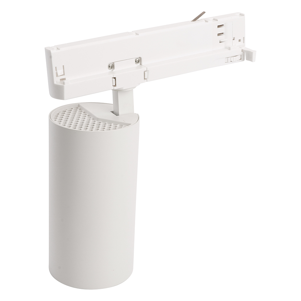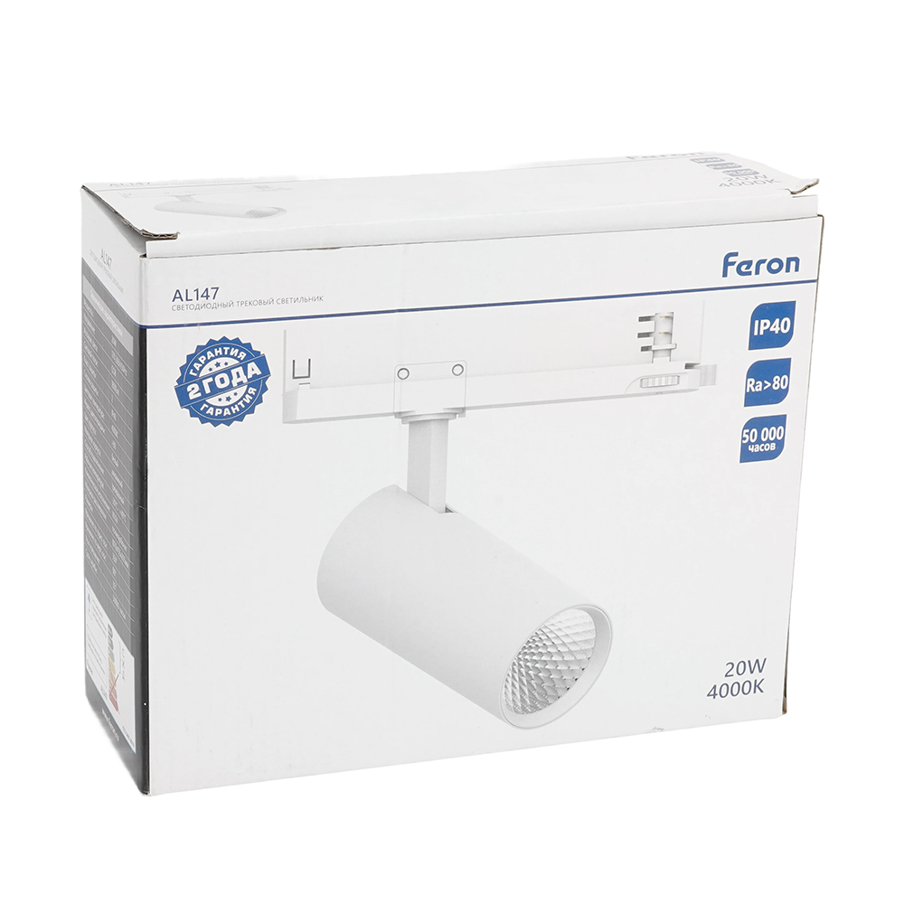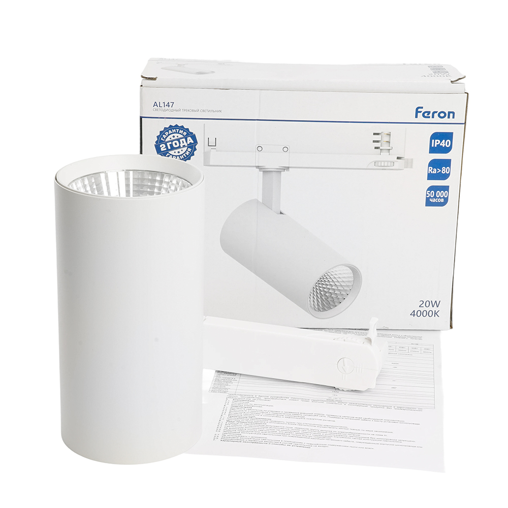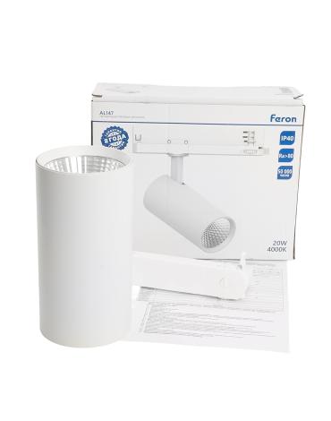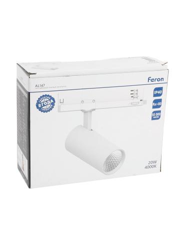 Светильник трековый на шинопровод, трехфазный (ДПО) FERON AL147, 20W, 4000К (белый), 170-265V, 1800Lm, цвет белый, корпус алюминий, рассеиватель поликарбонат, вращение →350°/↓90°, 205*70*155 мм